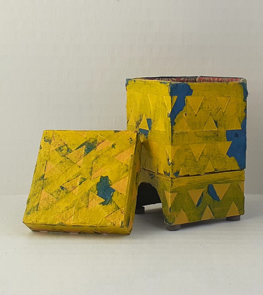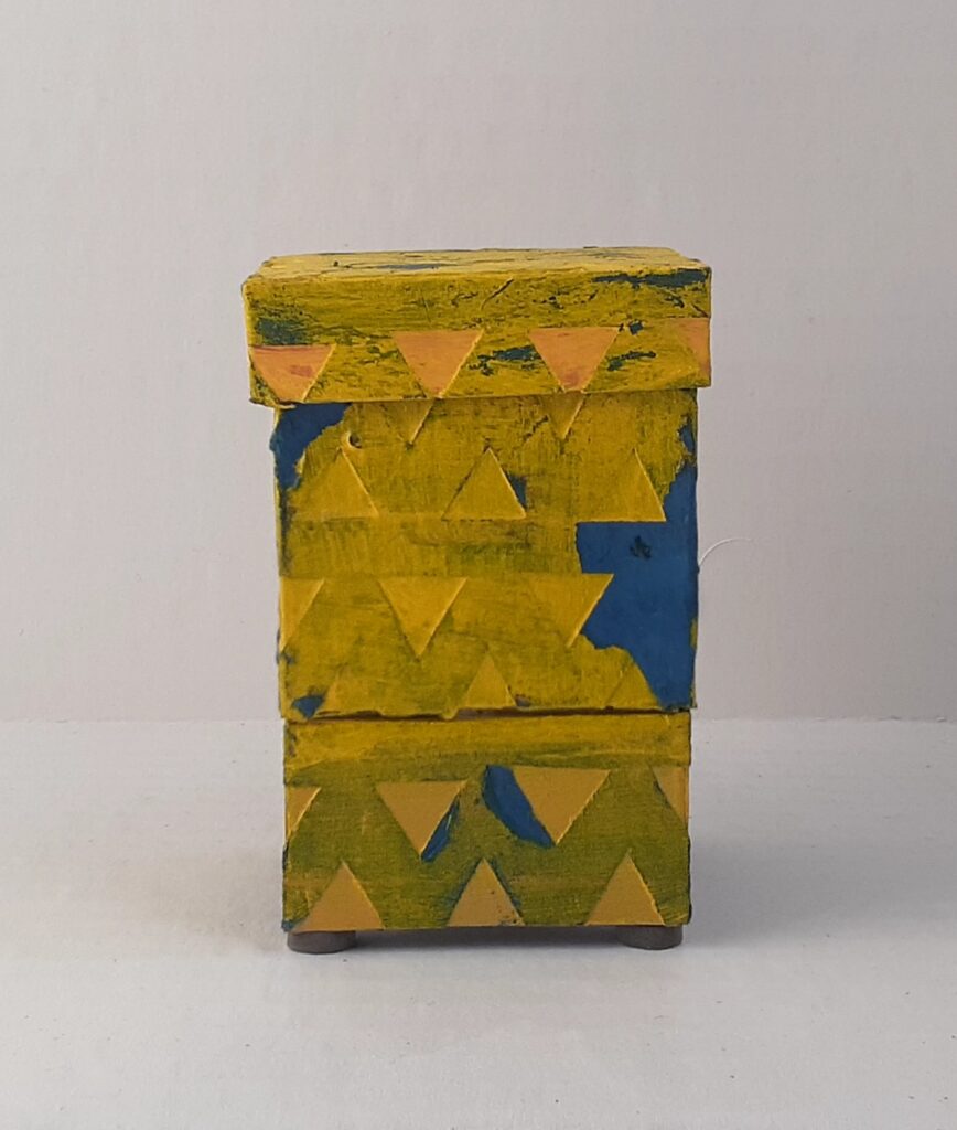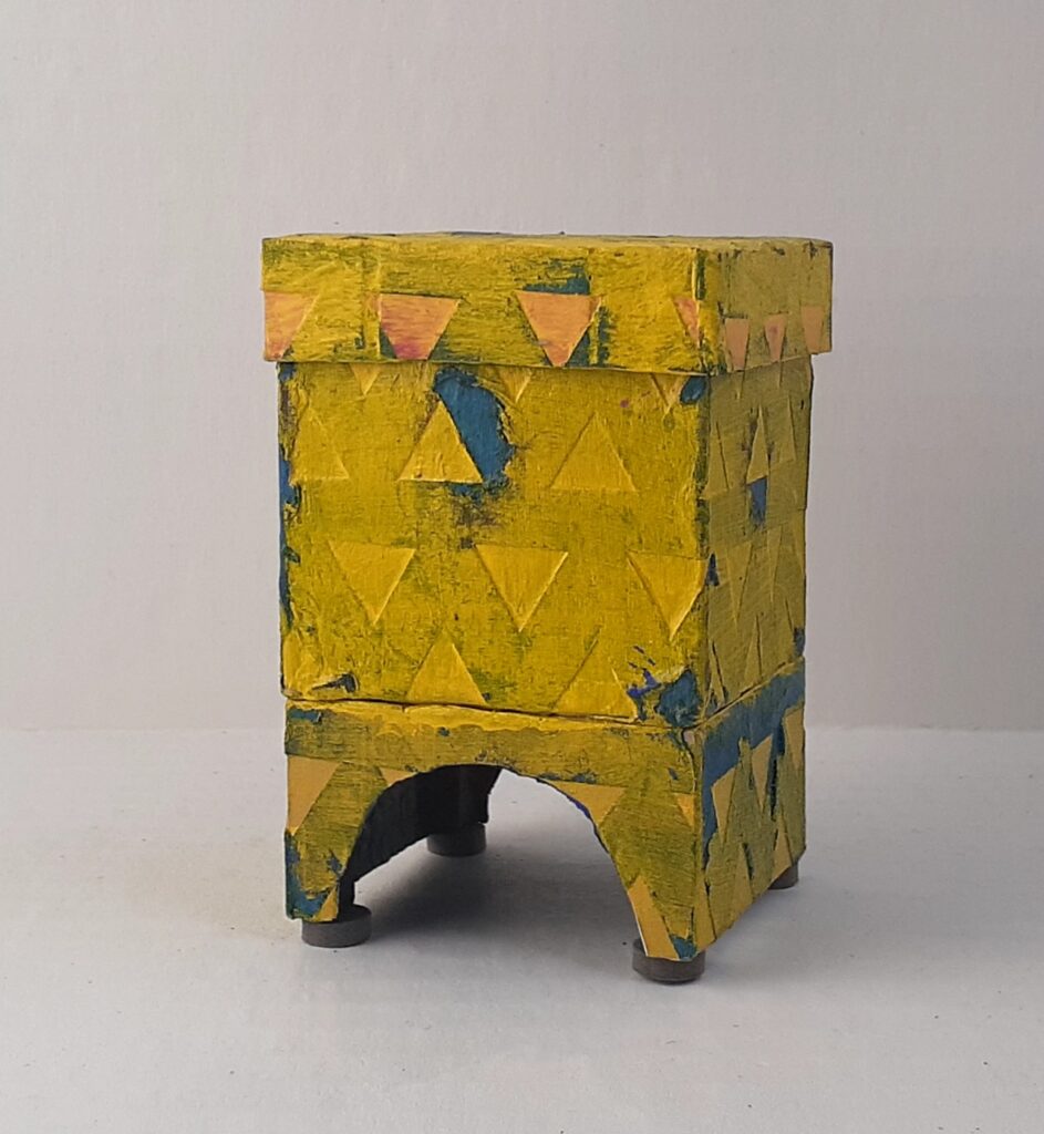Stressed box, 2024, 2 1/4″×2 1/4″×3 1/8″, decorative paper, Bristol board, acrylic.